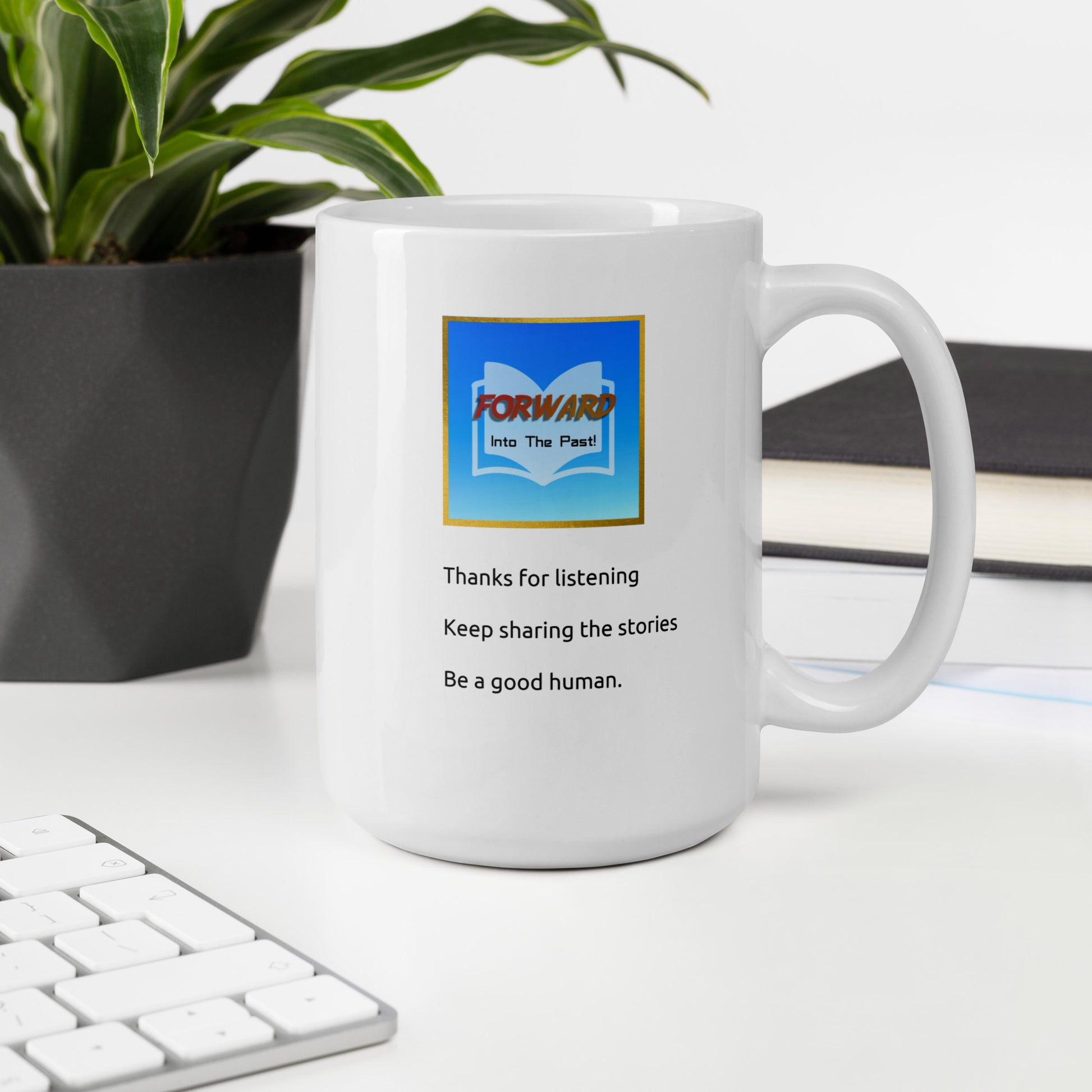 This stylish mug is perfect for any fan of the public domain podcast "Forward Into the Past". The mug features a white glossy finish with the podcast's logo and tagline: "Thanks for listening, Keep sharing the stories, Be a good human."